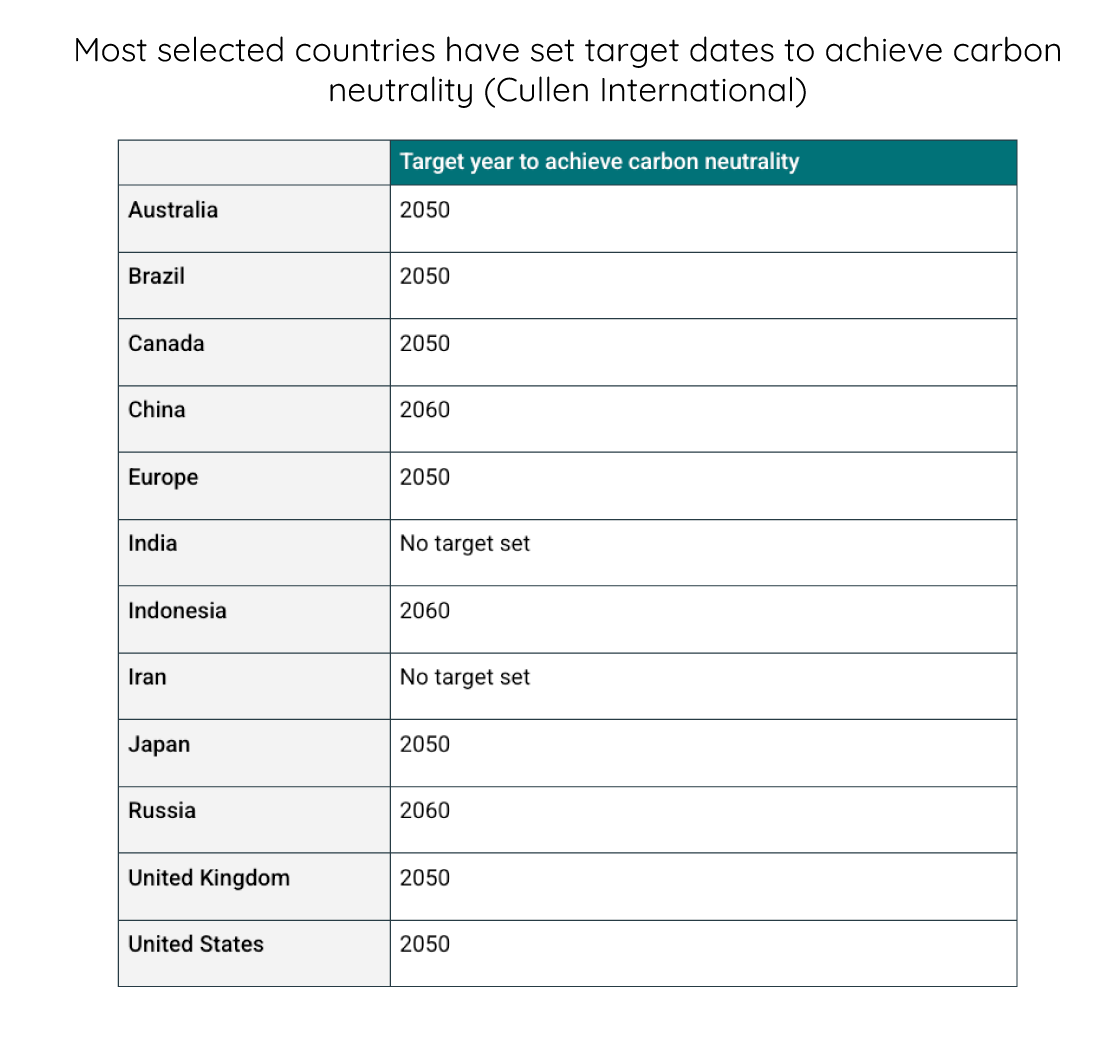 Cullen International’s updated benchmark shows the emission reduction targets for 2030 and 2035 of the ten largest emitters of greenhouse gases (GHGs), plus the EU and the UK, based on their latest available NDCs. The benchmark also shows by which year the country aims to reach carbon neutrality, if such a target has been set.