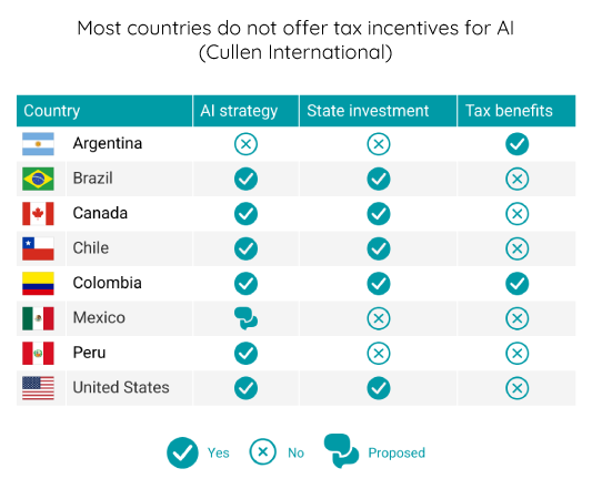 The strategies for fostering AI vary across the region. Some governments invest in AI research, workforce skills, and access to computing hardware. Argentina and Colombia are the only countries to offer tax incentives for AI developers.