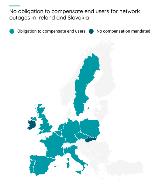 In 11 of the 13 European countries studied, consumers have a legal right to compensation in the event of service failures. No such obligation exists in Ireland and Slovakia, but operators in both countries must provide information on any compensation that may apply if the contracted service quality levels are not met.