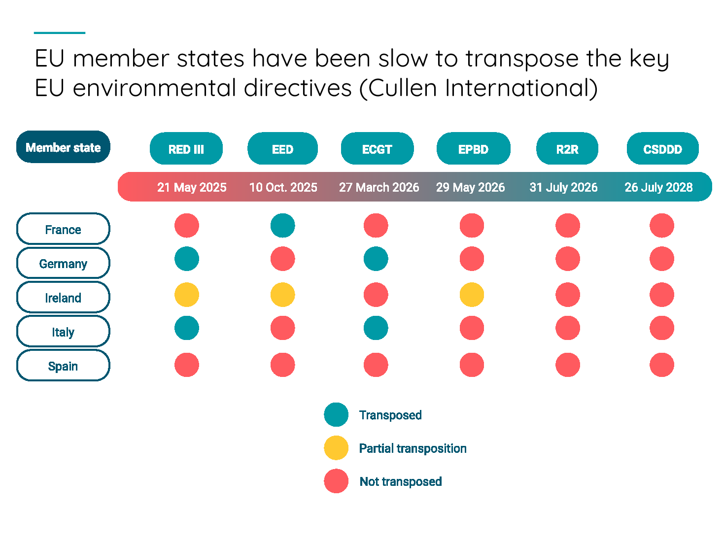 The deadline for the transposition of the EED also expired on 10 October 2025, yet only four member states had completed the transposition by that date. Several others have transposed the directive only in part, including seven that have done so specifically for the provisions concerning data centres.